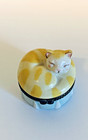 Trinket Box With Sleeping Cat & Mouse Porcelain Hinged Lid Bow Clasp