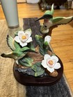 Hummingbird Resin Figurine On Branch With Flowers & Wood Base