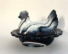 (excellent) Vintage Mosser Slag Glass Hen On Nest Blue And White On Dish 4.5"