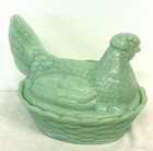 Vintage L E Smith Jadeite Chicken Hen On Deviled Egg Dish Green Milk Glass