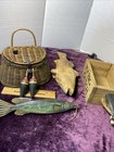 Lot Of 3 Vtg Old, Small Wicker Creel Buckle Fishing Basket+3carvedfishj352