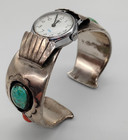 Vintage Navajo Watchband Cuff Bracelet, Shadowbox Turquoise, Coral Sterling 6.25