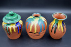 Mexican Terra Cotta Pottery Jar & Vases Green Blue Yellow Drip Glazed 3pc Set 7'