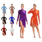 Women Glittery Lyrical Dance Costume Long Sleeve Flowy Tulle Skirt Leotard Dress
