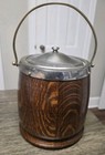 Vintage English Biscuit Barrel Humidor Oak Wood Silverplate Trim Porcelain Liner