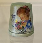 Anri Italy 1987 Wooden Thimble Girl Vintage With Bird Flowers Hand Painted