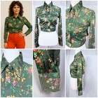 Vintage Jinny Jin Disco Cropped Button Down Green Floral Dagger Collar Shirt Xs