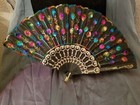 Antique Folding Hand Fan Painted Silk Sequin Fabric & Carved Bone Sticks