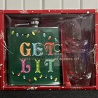 Hip Flask & Shot Glasses Set Christmas Holiday “get Lit” Green W Lights 3 Piece