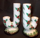 Pair Christmas Candy Cane Holly Berry Ceramic Candle Holders Hand Painted