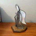 Stained Glass Angel Votive Candle Holder Wooden Base Etched Detail 9"