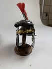 Miniature Roman Centurion Helmet Metal Red Plume Wood Stand Decor Collectible