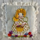 Vintage Hand Embroidered Girl Ticking Stripe Pillow Eyelet Lace 3d Yarn Hair