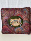 Cute!vtg Handmade Boho Gypsy Cat Needlepoint Striped Tufted Throw Pillow 13"x14"