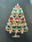 Christmas Tree Brooch/pin, Gold Tone Metal And Colorful Red/green Rhinestones,