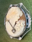 Antique Sterling Silver & Natural Diamond Habille Shell Cameo Brooch Pin
