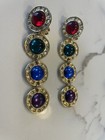Vintage Florenza Signed Gold Tone Clip On Earrings Rhinestones Green Orange Purp