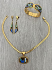 W Germany Green Glass Iridescent Cameo Necklace Clip Earrings Filigree Jewelry
