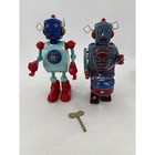 Vintage Tin Toy Robots Wind Up Musical Drummer & Dancer Set With Key