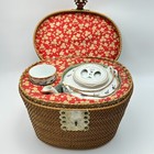 Chinese Porcelain Tea Pot 2 Cups Floral Wicker Basket Carrying 12x9 Vintage