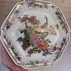 Vtg Japan Peacock & Floral Hexagon Plate Dish Gold Trim Trinket Candy Ashtray