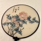 Vintage 70s Japanese Silky Round Fan Flowers & Bird Calligraphy Wood Handle 9”