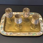 Vintage Abalone Mother Of Pearl And Brass Cordial Shot Glasses Cups Serving Tray