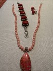 Four Piece Jewelry Set, Necklace, Bracelet And Earrings, Red And Coral Colors