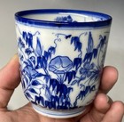 Blue & White Chinese Lidded Porcelain Teacup & Saucer, Mountains Waterfall Epoc