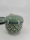 (2) Two Korean Ceremonial Lattice Celadon Tea Cup Saucer Infuser Lid
