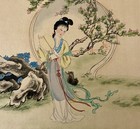 Vtg Chinese Watercolor Silk Painting Woman Cherry Blossoms Phoenix Border Signed