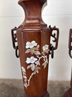 Vintage Japanese Pair Of Wood & Inlaid Mother Of Pearl 12” Vases