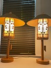 Pair Vintage 1960s Faux Bamboo Tiki Lamps W/ Original Woven Shades & Inserts