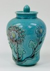 Antique Chinese Rare Blue Majolica Small Lidded Jar Flowers In Relief 3-1/4"