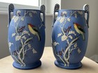 Antique Pair Nippon Hand Painted Moriage Vases Bird Blue Morimura M In Wreath 8”
