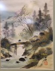 Japanese Original Watercolor On Silk Mountain River Landscape Painting Signed