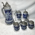 Vintage German Beer Stein 6pc Set W/ Pewter Lids & Cobalt Blue Salt Glaze Finish