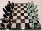 Vtg Chess Set: Marble Onyx Board & Glass Tiki 32 Pieces. Black, White, Lt Green
