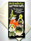 Halloween Greeting Card Vintage Party Invite Green Face Goblins Witch Cauldron