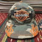 Vintage Y2k Harley Davidson Embroidered Flames Camo Green Strapback Hat Cap