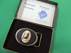 Vintage Inlay Scrimshaw Brass & Leather Belt Buckle W/ Box & Whale/ship Necklace
