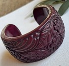 Bakelite Carved Dark Cherry Leaf Open Wide Cuff Bracelet