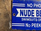 Rare Vintage Porcelain Enamel Sign No Photos Nude Beach Swim Suits Optional Sign