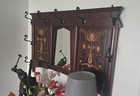 Antique English Marquetry Inlaid Art Nouveau Mahogany Wall Mounted Mirrored Coat