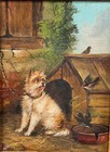 Antique Oil Painting Terrier Dog Bird 19th C. Victorian American Folk Art Signed