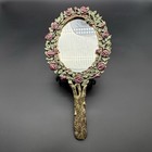 Vtg Art Nouveau Brass Repousse Vanity Hand Mirror Pink Enamel Roses Rhinestones