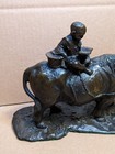 Antique Chinese Bronze Of Boy With Basket, Flute, On Water Buffalo 8.5” High