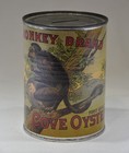 Antique Monkey Brand Cove Oysters Tin Can Advertising Fait Slagle Coin Bank