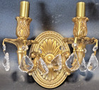 Antique Brass And Crystal Ornate Flower Double Arm Sconces W/ Shades