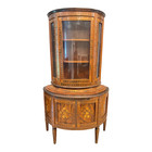 Pair Early 20thc. Italian Inlaid Demilune Curved Glass China Cabinets Vitrines